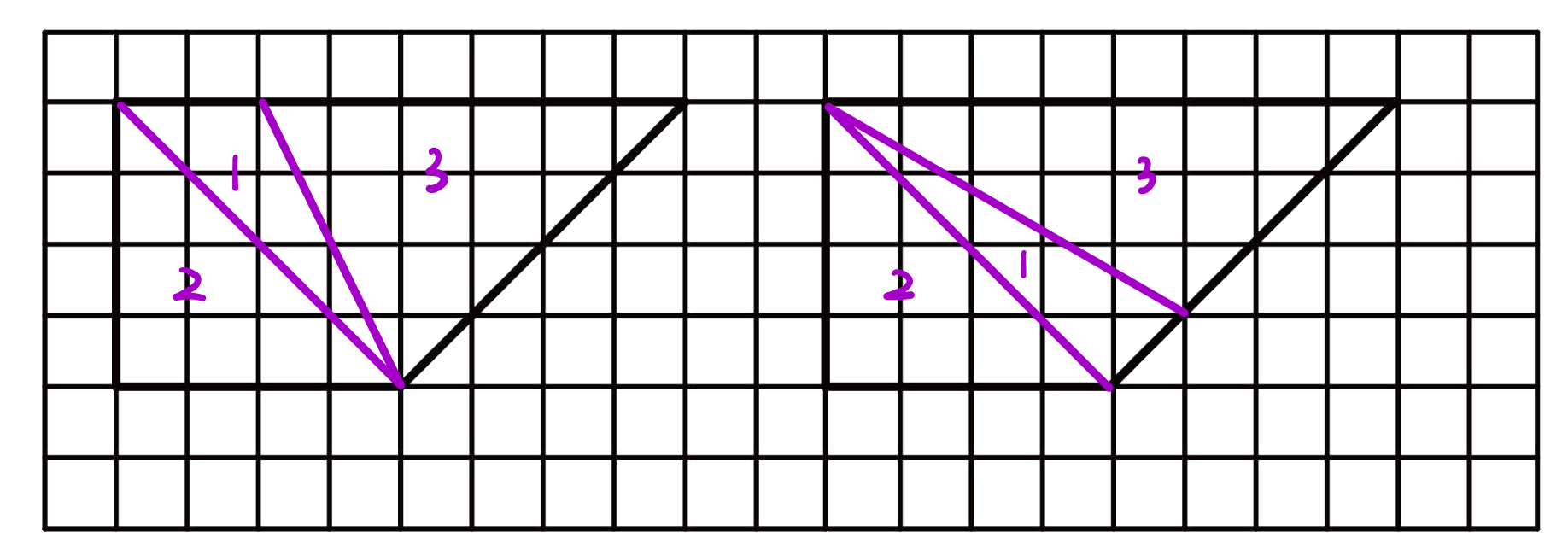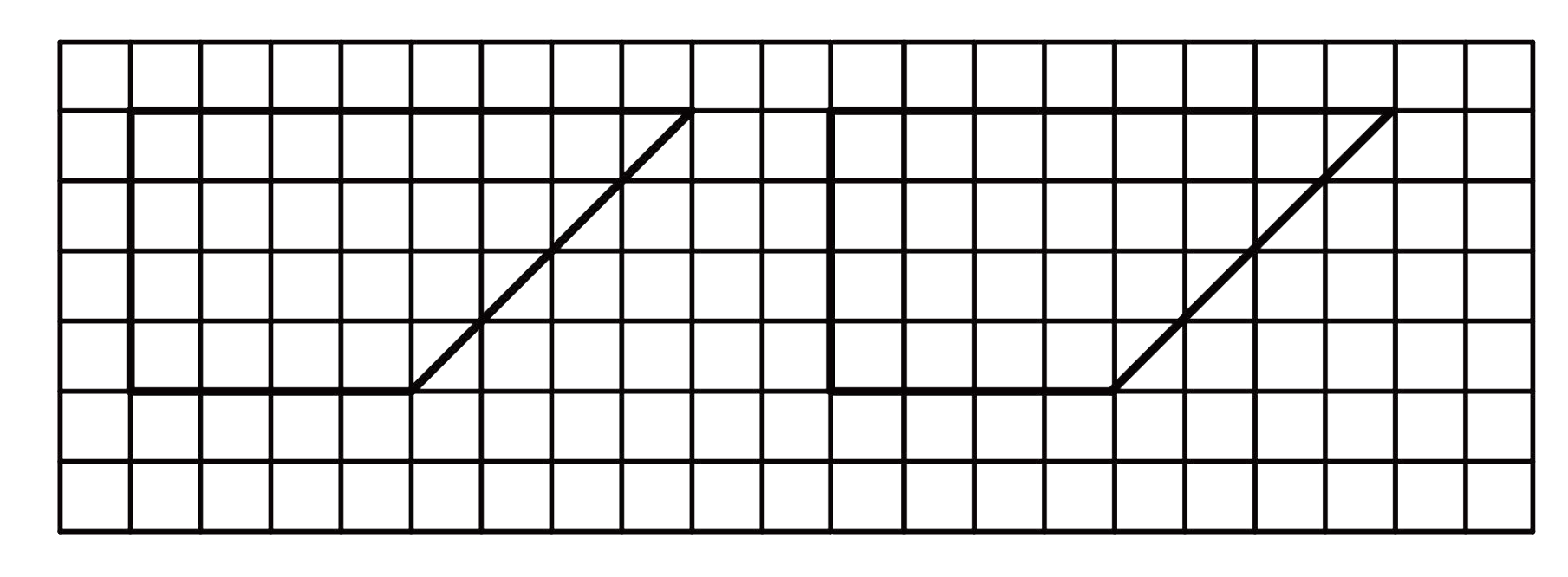 - 由边长相等的小正方形组成的网格中有一个梯形,请你用两种不同的方法把这个梯形分为$ 3 $个三角形,使$ 3 $个三角形的面积比是$ 1:2:3$。